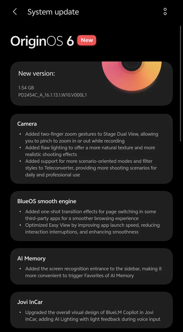 正如下面的截图所示,新更新的下载量为 1.54 GB,其中包含了半打以上的总体变化。在显示的七项更新中,有三项专门针对相机进行了改进。可以说,新增的 Raw 照明功能是最大的变化。以前只有在 X300 ProRaw 光效旨在通过最小化 AI 和 HDR 效果来创建更逼真的图像。
