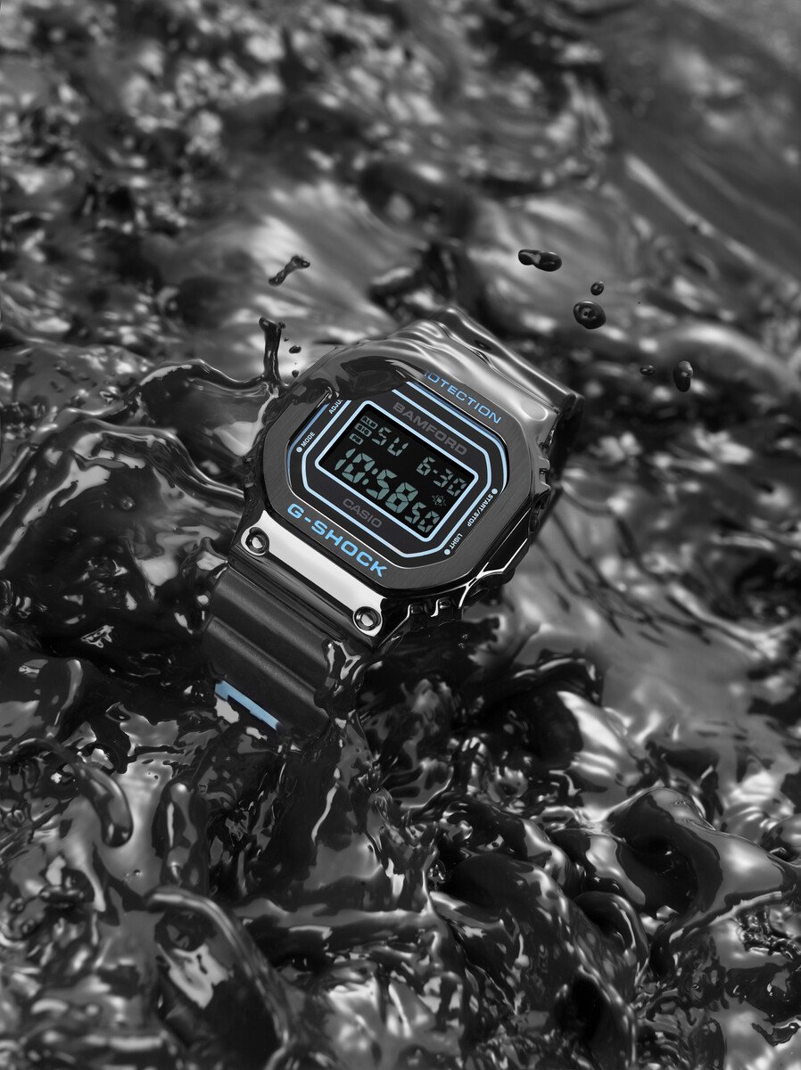 虽然最初的发布集中在基本功能上--抛光黑色表面、负液晶显示屏和班福德标志性的淡蓝色装饰--但这些新图片让我们对这款手表的个性有了更好的了解。一张引人注目的产品照片将 GM-5600 置于浓稠的黑色液体中。另一张照片则捕捉到手表似乎在融化或滴落,展现出其光亮的外表。两张照片都展示了表带上的哑光班福德品牌标识与抛光金属表壳之间的美学对比。